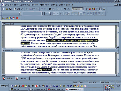 Еще одной особенностью своего текстового редактора создатели называют возможность исправления текста, набранного в другом языковом регистре. Все, что для этого надо — это «выделить фрагмент текста, нажать правую клавишу мыши и выбрать команду «РУС/ЛАТ». То, что воспринималось «на ура» в 1997 году, сегодня, с появлением программ, способных «на лету» исправлять раскладку клавиатуры (типа Keyboard Ninja и Punto Switcher), выглядит анахронизмом. Визуальное форматирование абзацев текста тоже разочаровало. Изменений мало. Да, теперь можно работать не с одним абзацем, как раньше, а сразу с несколькими выделенными. Однако все, что вы можете — это сменить высоту или ширину текста. Полноценно форматировать весь текст визуально вам все равно не удастся. А форматировать текст по абзацам, на мой взгляд, глупо, т.к. я могу изменить внешний вид абзаца и не прибегая к визуализации — что будет быстрее и проще. Лексикон также позволяет осуществлять простейшие верстальные операции a la создание брошюр. При выборе этой функции на одном листе бумаги будут размещаться две странички половинного формата, из которых вы, возможно, сможете что-то сделать. Однако, вместе с тем функция предварительного просмотра печати поражает своим аскетизмом. Максимум, что вы можете из нее выжать, — это отображение сразу двух страниц на экране. Если у вас в документе, к примеру, сорок страниц, то все сорок вам придется листать попарно. Работа со стилями и шаблонами русских документов (коих насчитывается более сотни самых разнообразных, и, которые, по слухам, можно даже пополнять), как я и думал, на высоте. Впрочем, ничего кардинально нового по сравнению с версией Лексы'97 я не заметил. Наконец-то в версии 5.1 решена проблема редактирования таблиц с большим количеством столбцов — теперь вы смело можете создавать таблицы, где их хоть тысяча. Изменился к лучшему и список шрифтов, наиболее часто используемые группируются вверху списка. Кроме того, Лексикон полностью поддерживает стандарт Unicode, но по-прежнему позволяет использовать и старый формат шрифтов. Появилась полноценная работа с «горячими клавишами», которые почему-то названы «клавиатурными командами». По умолчанию их всего 29, однако, в любой момент вы можете назначить нужные вам сочетания. Что касается сравнения документов, то здесь мне сначала ничего не удалось проверить. Чтобы сравнивать документы, их надо иметь. Что же проще, решил я, открыл один из имеющихся у меня документов, чуть-чуть его модифицировал и… тут мне вздумалось проверить, как Лексикон работает с html файлами. Я подкинул ему мою любимую книжку в виде файла 600 Кб величиной. Лексикон задумался, посерел и завис. Что ж, бывает, решил я, большой файлик (хотя всеми другими используемыми мной редакторами он открывался без проблем), дадим попроще — открыл небольшую страничку, но отобразилась она в странном виде. Когда же я вернулся, наконец, к сравнению документов, то моему взору предстала ужасающая картина. Прошу ознакомиться: (рис. 6)